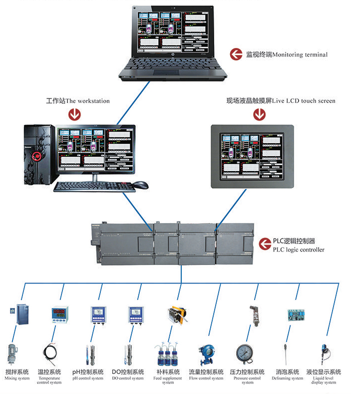 采用TFT液晶触摸屏,德国西门子S7-200系列PLC逻辑控制器,对发酵过程控制参数实时测量与控制。