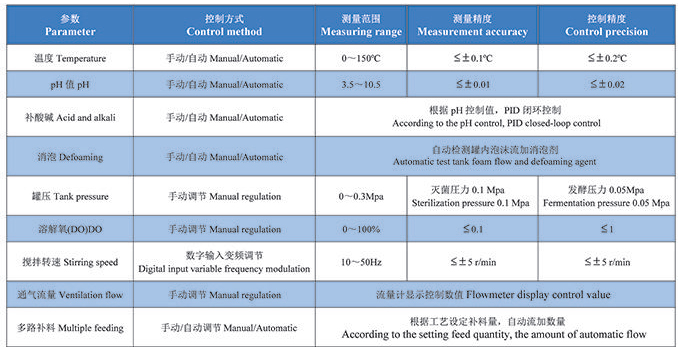 1、触摸屏显示并设定控制参数,实时动态显示发酵全过程,对温度、PH值、溶解氧(DO)、搅拌转速、通气量、压力实时测控。